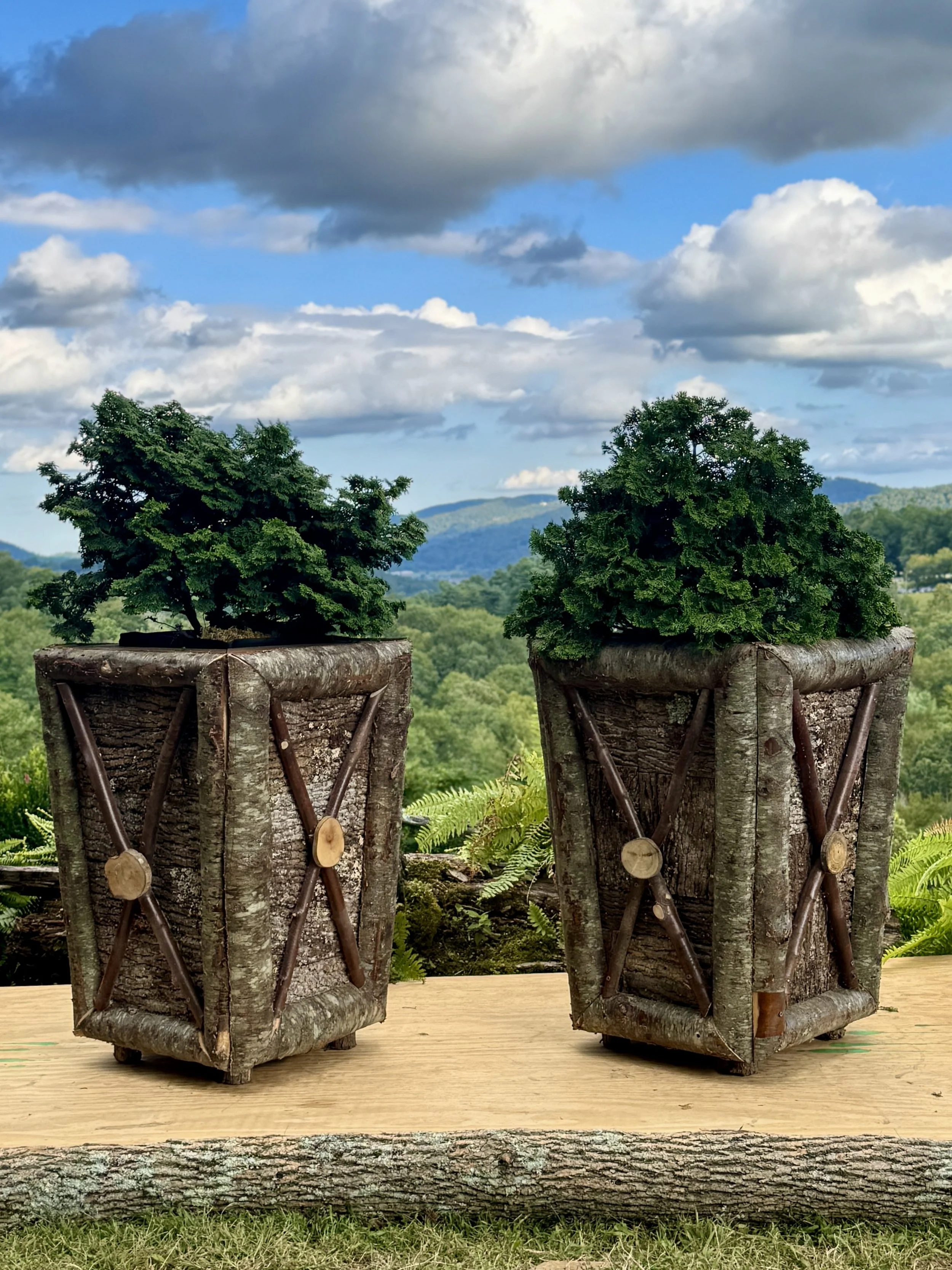 Poplar bark, sugar maple, locust, galvanized steel lining, recessed wheels.